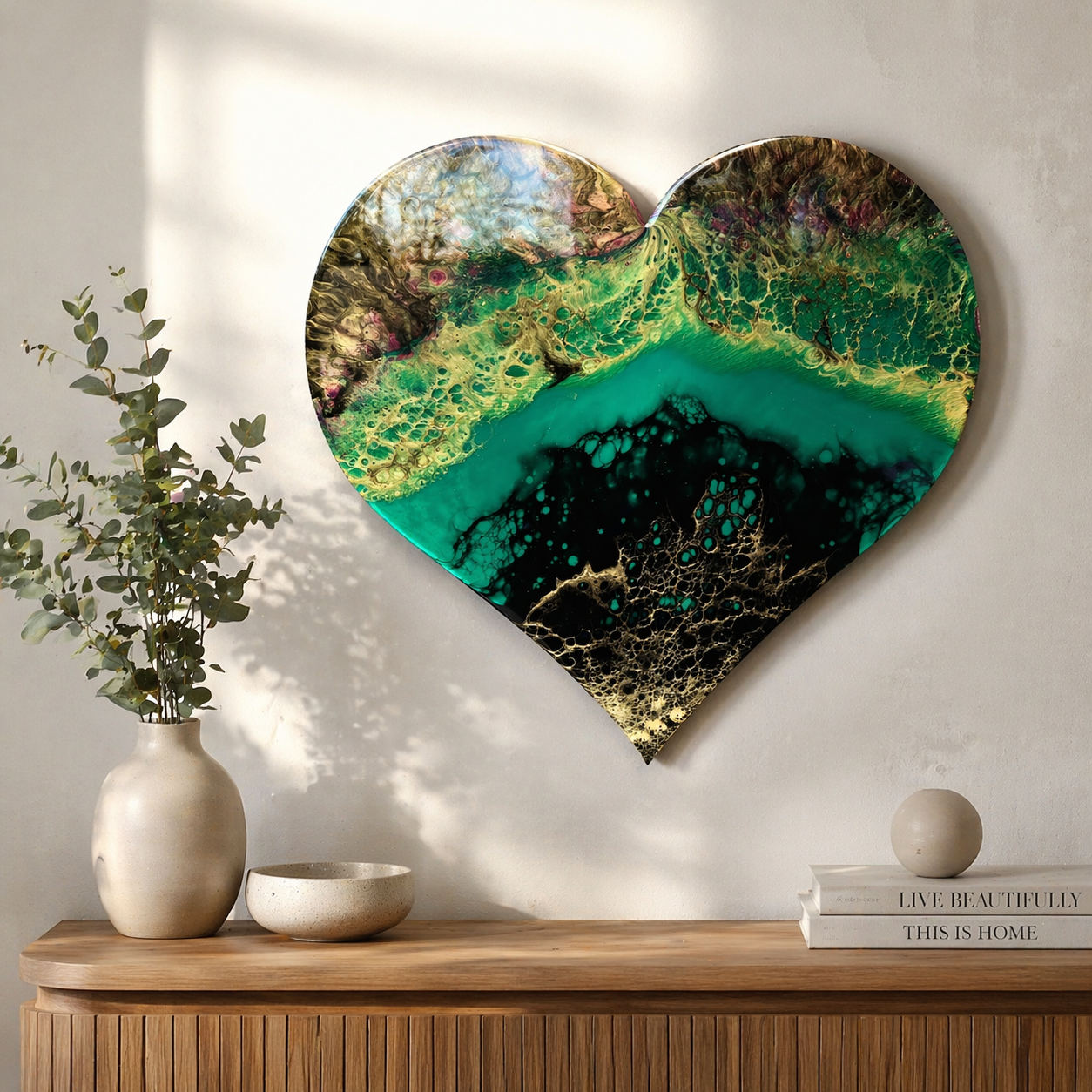Hand-poured in layers of resin, natural pigments and inks, this piece glows with depth and subtle iridescence. The heart-shaped board has been lovingly handcrafted by my husband, making this artwork a true collaboration of creativity and care.